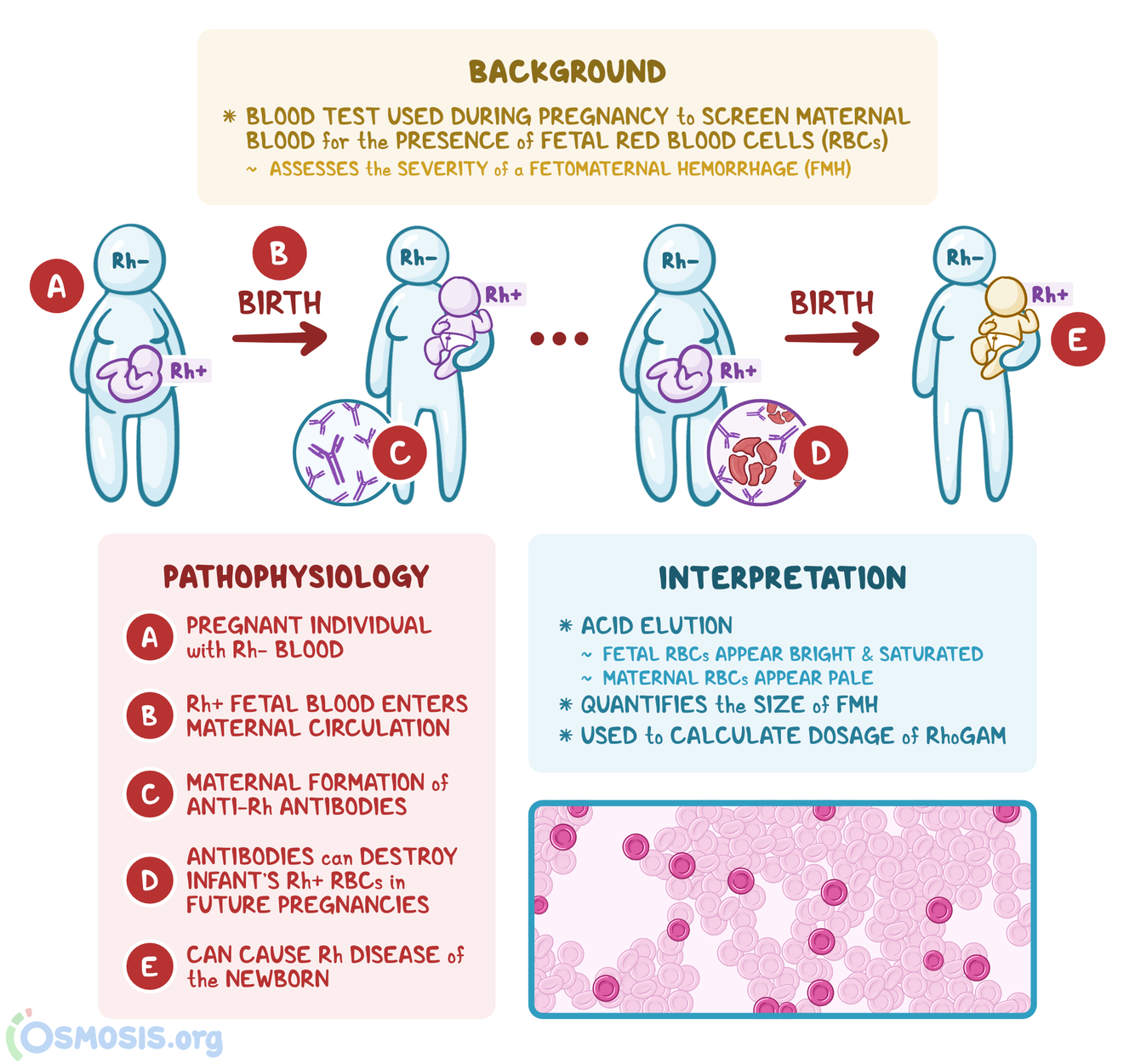 Interpretation involves acid elution - here fetal cells appear bright and saturated and maternal RBCs appear pale