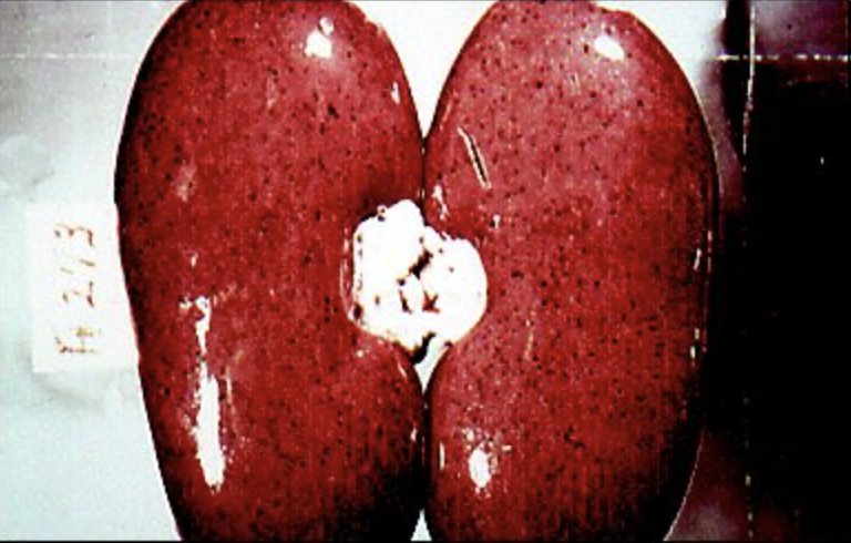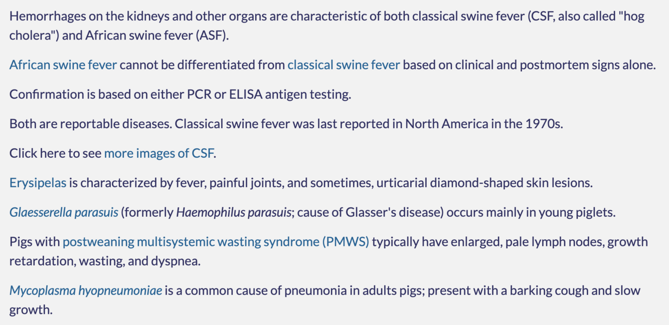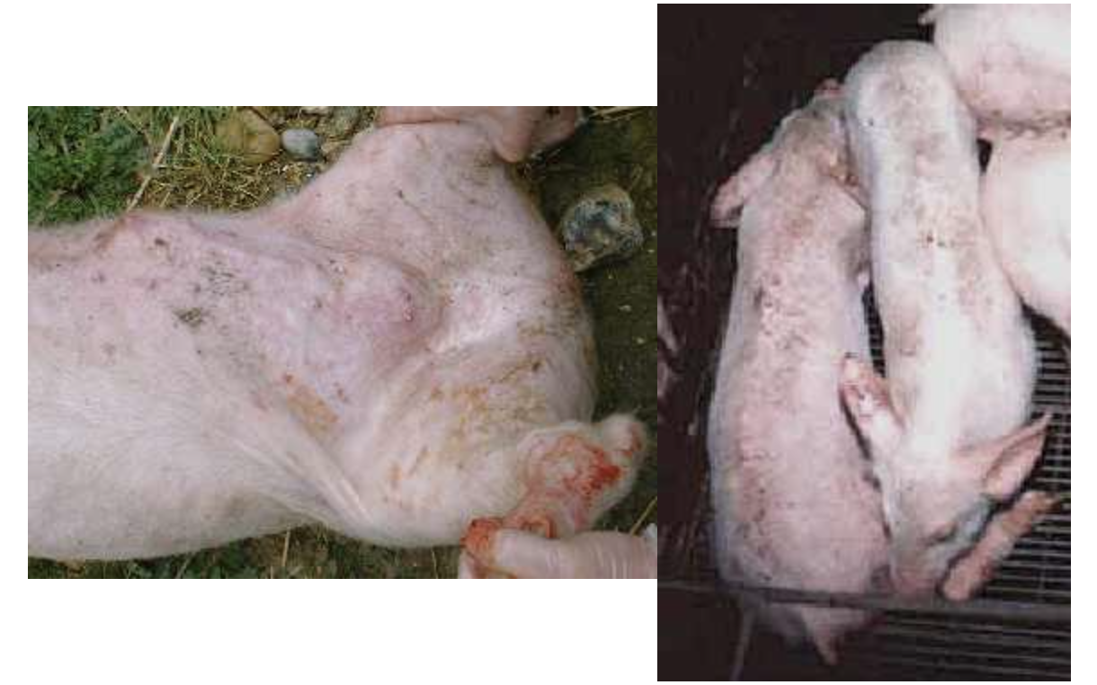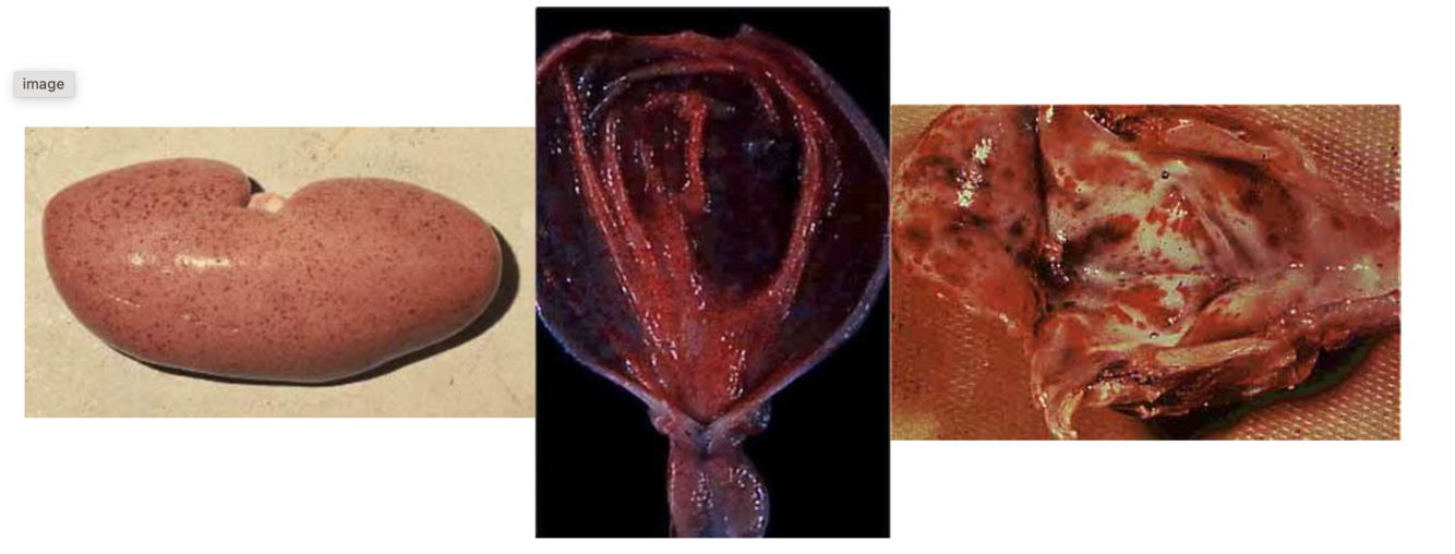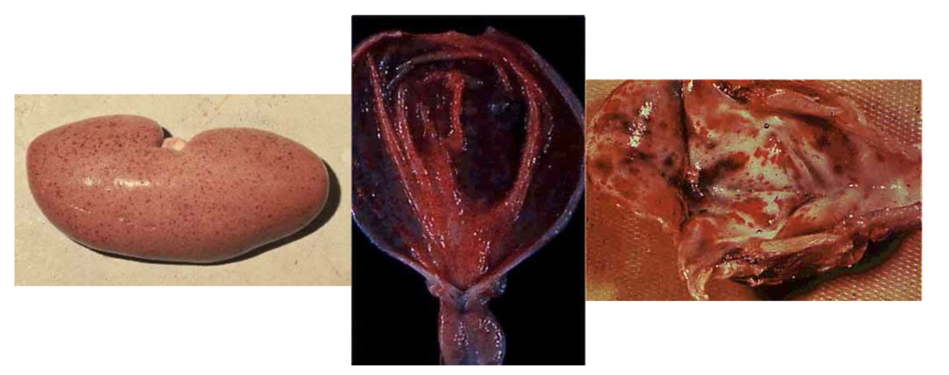 A necropsy on one of the dead pigs shows widespread petechial and ecchymotic hemorrhages in the kidneys (“turkey egg kidneys”), bladder, spleen, and larynx.