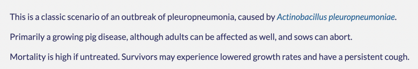 A commercial pig farm experiences an explosive outbreak of respiratory disease with high mortality, primarily in young pigs under six months of age.