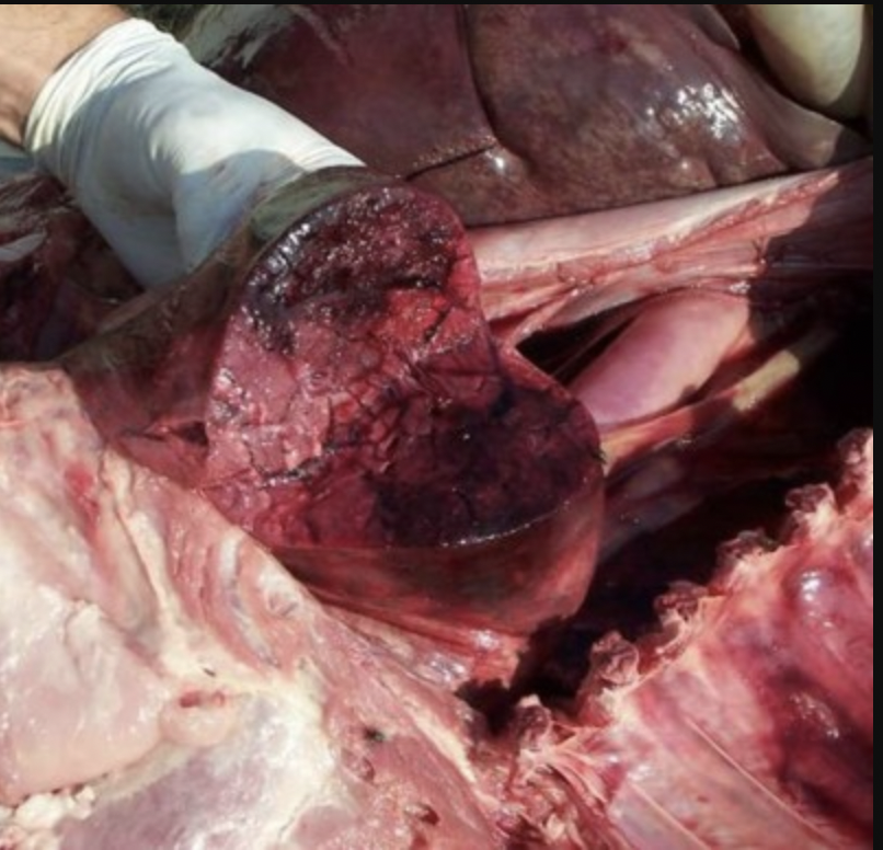 On necropsy, the lungs are bilaterally dark and swollen and ooze bloody fluid from the cut surface, as shown in the image below.