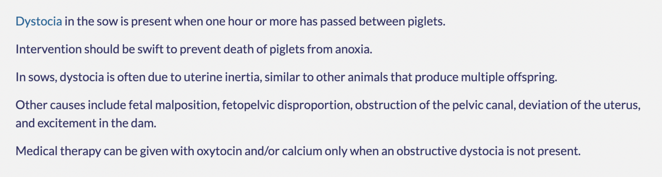 When a sow is giving birth, what is the shortest time interval between passage of piglets that indicates dystocia?