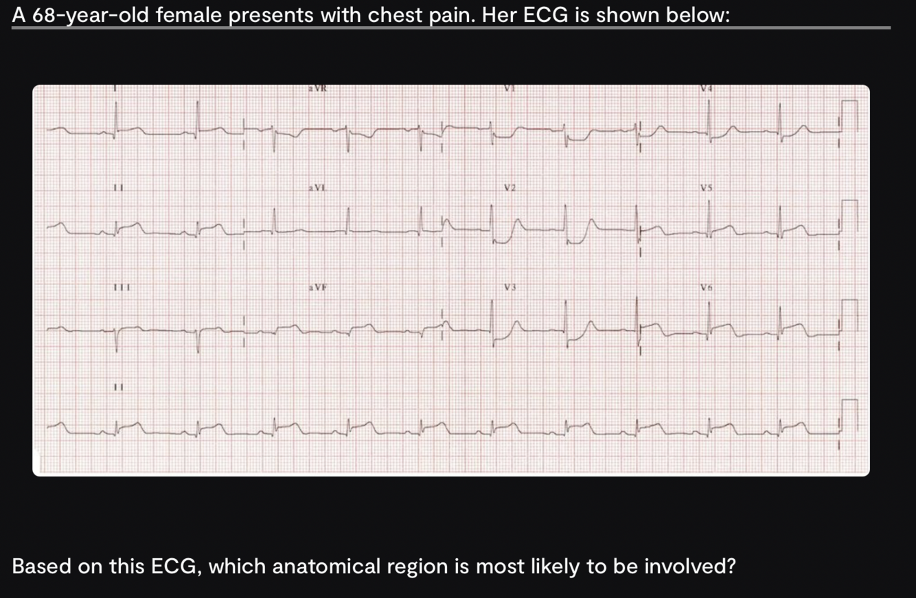 This ECG shows ST-segment elevation in leads II, III and aVF, and inferior ST depression in leads V1-V3. This is highly indicative of a posterior infarct. A posterior infarct usually accompanies an inferior infarct (As in this case) or a lateral infarct. A posterior infarct indicates the involvement of the posterior aspect of the left ventricle