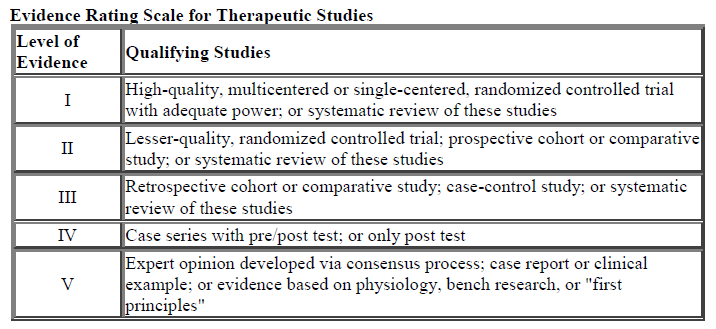 Level I data are defined as high-quality prospective cohort studies with adequate power or systematic review of these studies. Level II evidence represents lesser quality prospective cohorts, retrospective cohort studies, untreated control from an RCT, or systematic review of these studies. Level III evidence is correct and represents case control studies or systematic review of these studies. Level IV evidence is case series studies. Level V evidence is expert opinion, case report, or clinical example; or evidence based on physiology, bench research, or “first principles.”