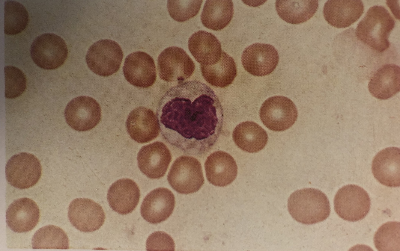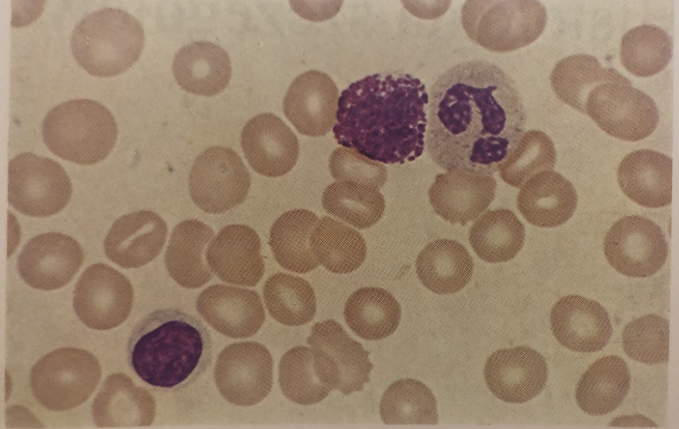 po lewej granulocyt kwasochłonny, zwykle jego jądro ma dwa segmenty, wyraźne ziarna; ziarna wyraźnie większe niż ziarna neutrofili; zawierają mediatory, enzymy