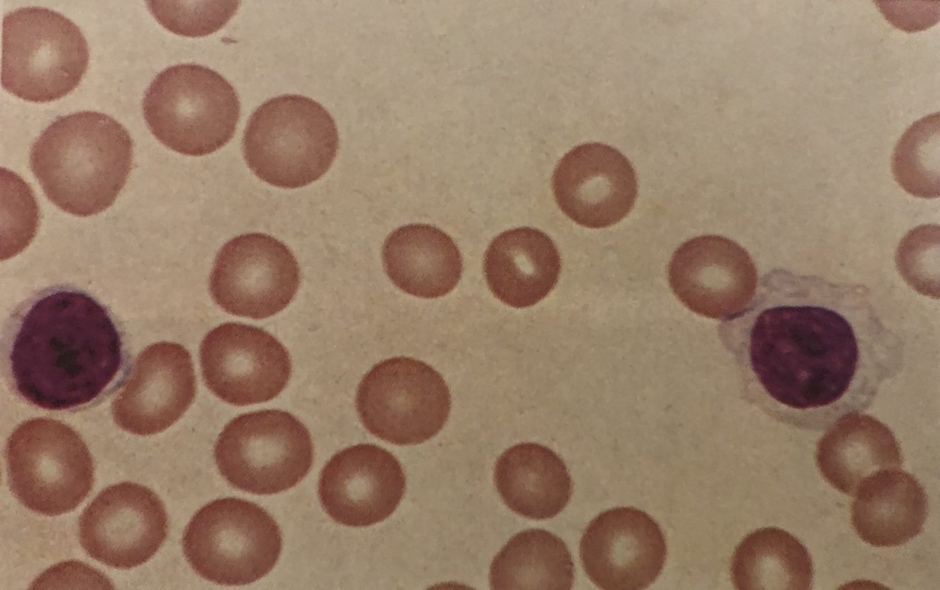 na dole limfocyt - wielkość porównywalna do erytrocytów, stosunek wielkości jądra do cytoplazmy