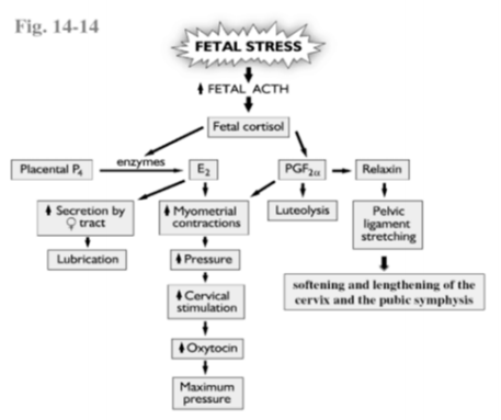In addition, Fetal cortisol causes the placenta to synthesize PGF2α which will induce myometrial contraction and also contribute to luteolysis.