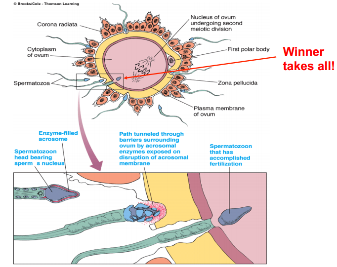 B. Enzymes from acrosome of sperm enable entry of the sperm into the cytoplas