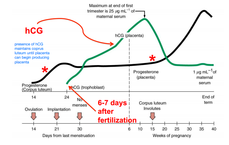 In attached figure, note that hCG levels decrease after progesterone begins being synthesized by the placenta. hCG is no longer needed at such high levels after the corpus luteum involutes and progesterone production is taken over by the placenta.
