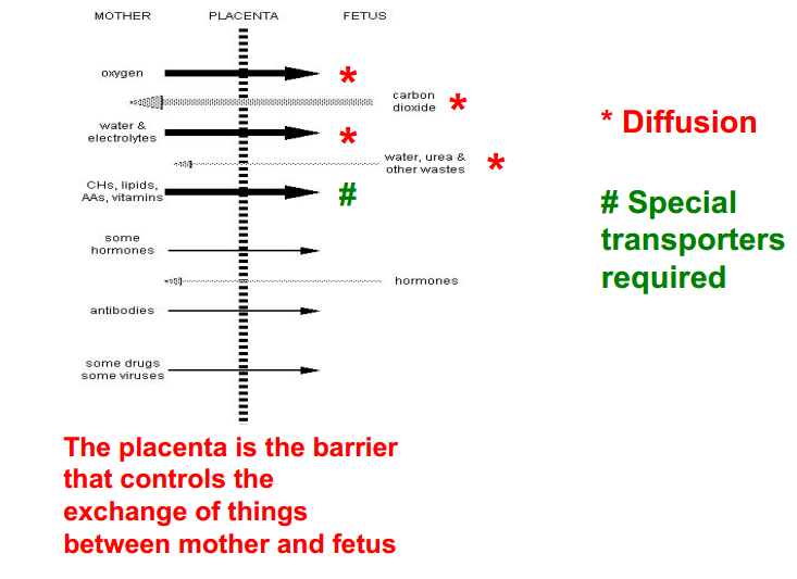 By what mechanisms do exchange of nutrients, oxygen, and fetal waste products occur in the placenta?