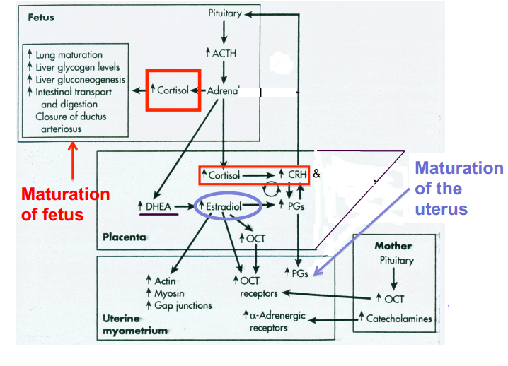 b. CRH acts on the fetal pituitary causing secretion of ACTH