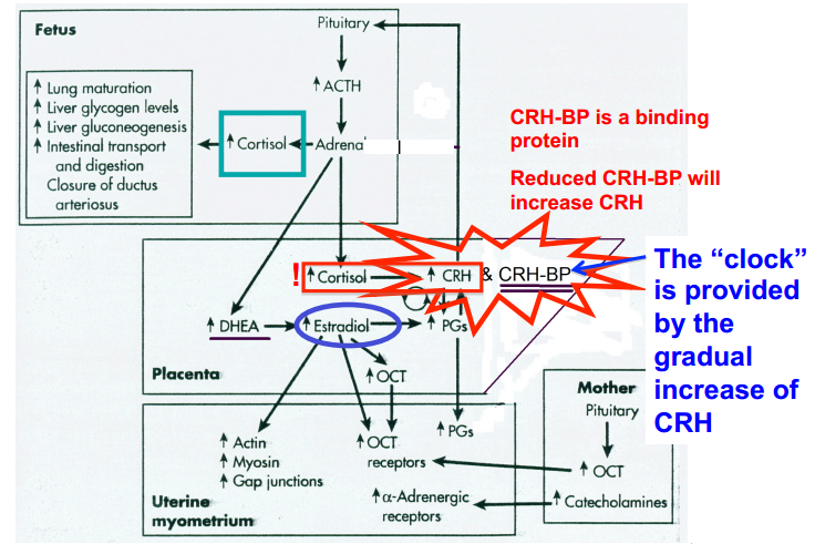 A binding protein synthesized by the placenta keeps CRH levels low. When the levels of this protein decreases CRH levels rise and cause the effects discussed.