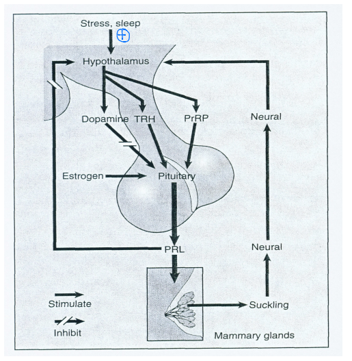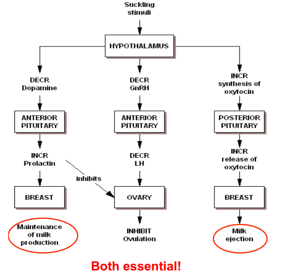 What hormones are affected by suckling? What are the results of changing these hormone levels?