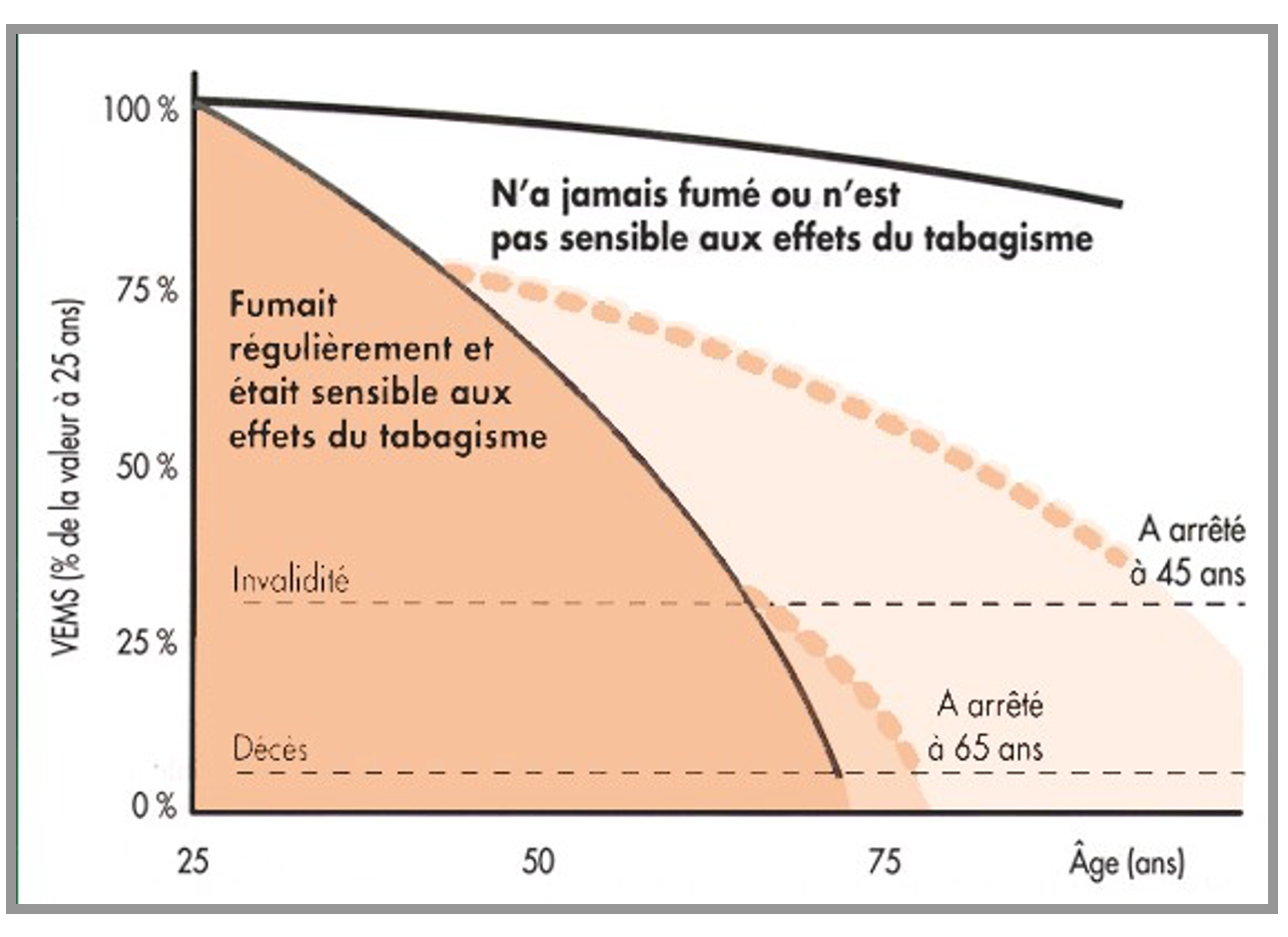 Tout d’abord, le déclin du VEMS chez les non- fumeurs est de l’ordre de 25 ml par années; ce déclin est accéléré chez les fumeurs qui présentent une susceptibilité individuelle au tabac.