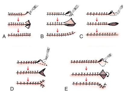 List two sepcialised methods for correcting dog ears in wounds which are 2cm or smaller