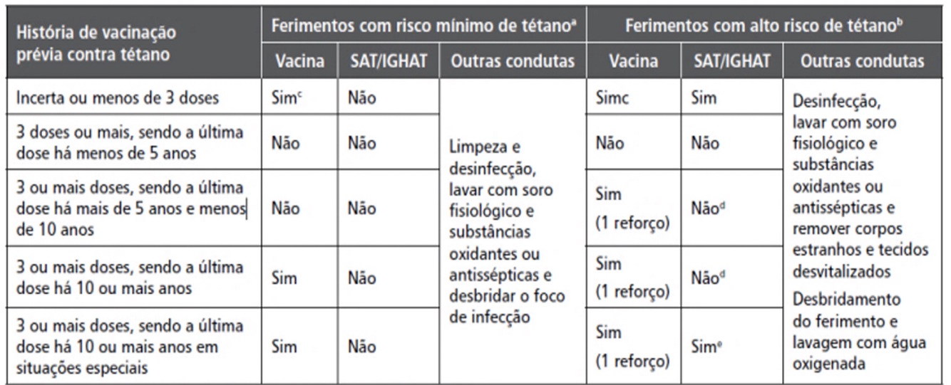 Em casos de ferimentos com alto risco de tétano, é indicado o uso de SAT ou IGHAT em todos os pacientes, independentemente da história vacinal.