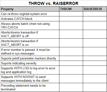 Syntax for THROW statement with parameters. Where can you use this? Describe its behavior when you use it outside a TRY-CATCH construct, inside a TRY block, in an open transaction with XACT_ABORT off, in an open transaction with XACT_ABORT on and not using TRY-CATCH, in an open transaction with XACT_ABORT on and using TRY-CATCH.