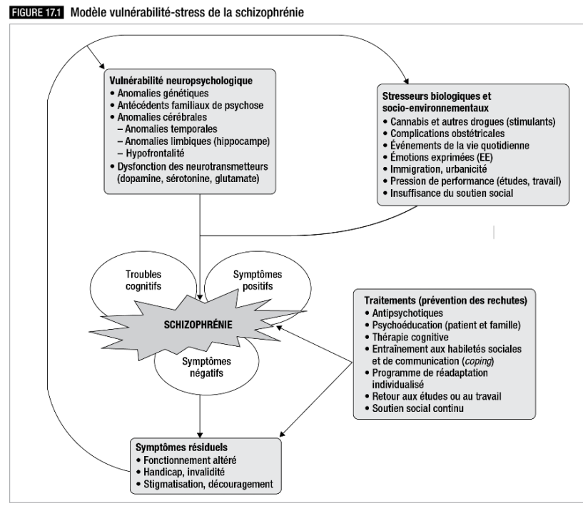 Décrire les différentes facettes du modèle de vulnérabilité au stress de la schizophrénie.
