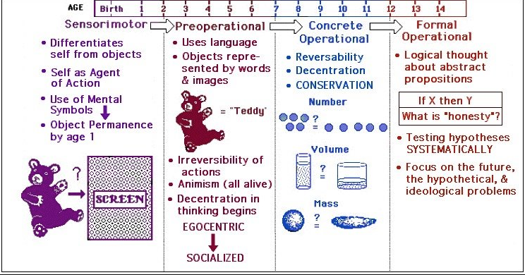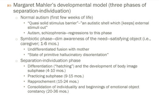 1) oral (0-18mo) = désintégration (crainte de fusion) 2) anal (18mo-3ans) = annihilation (crainte de persécution) 3) phallique (3-5 ans) = oedipe = separation 4) latence (5-puberté) = castration 5) genitale (> puberté) = surmoi