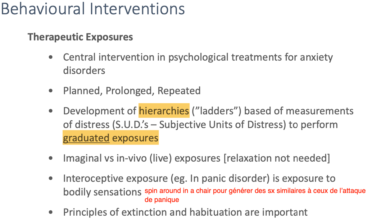 Le patient est placé dans la situation qu’il craint le plus, sous conditions contrôlées, en appliquant relaxation PRN. Principe de l’extinction : diminution de la peur et de l’anxiété maladaptée avec le contact prolongé avec le stimulus craint