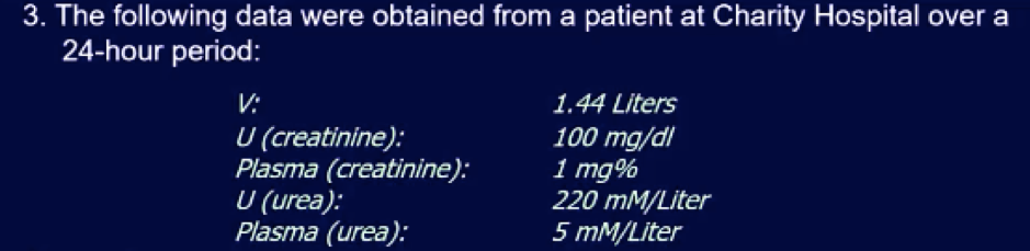 (1440 mL/day / 24 hours/day / 60 min/hour) * 100 mg/dL / 1 mg% = 100 mL /min