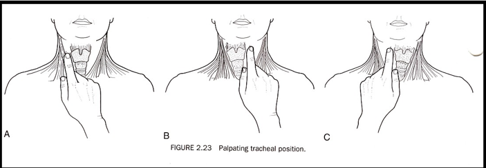 Pneumothorax or ipsilateral direction - negative pressure pulls the trachea towards this side. Will hear no breath sounds if collapsed lung; Emergency situation.