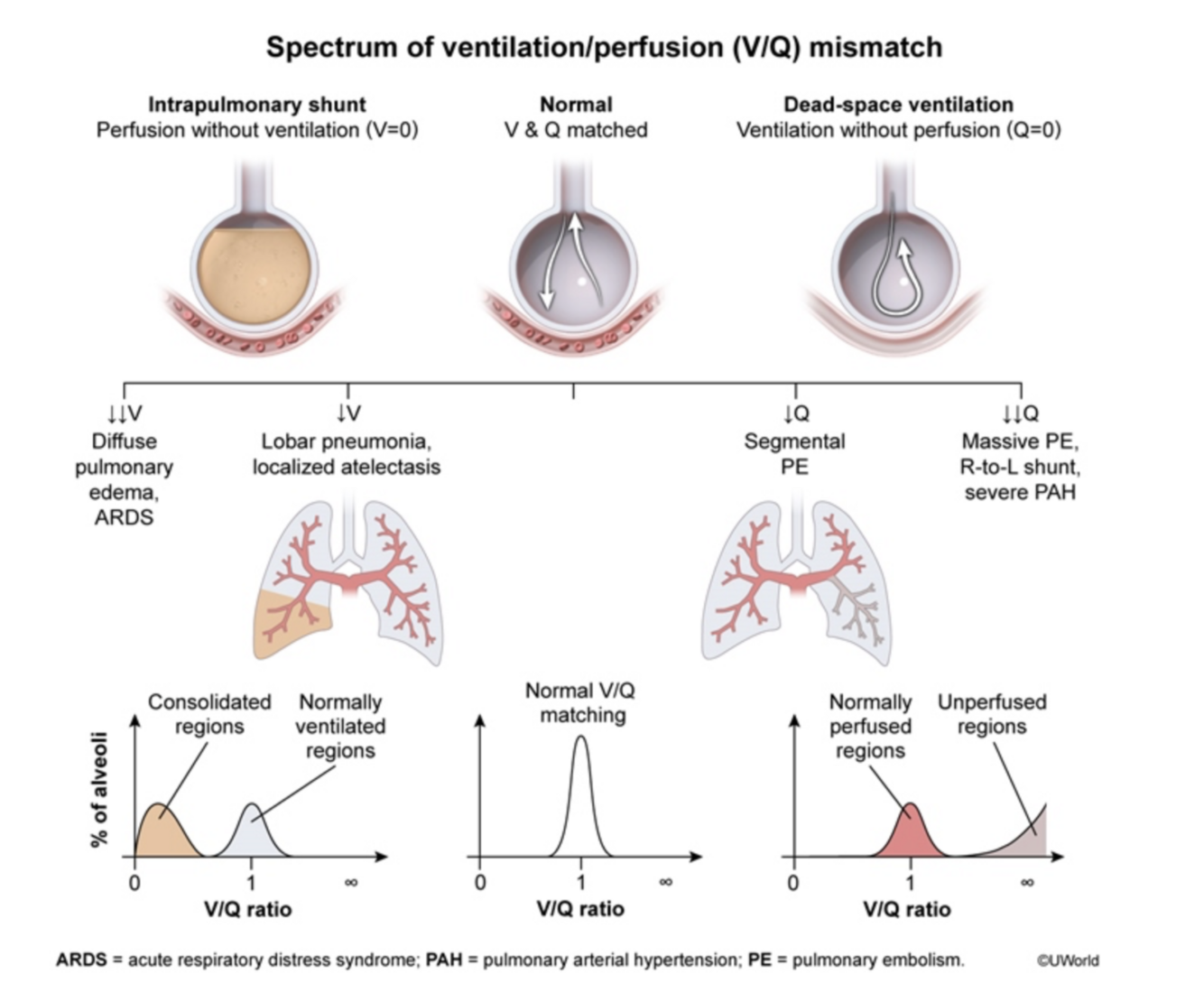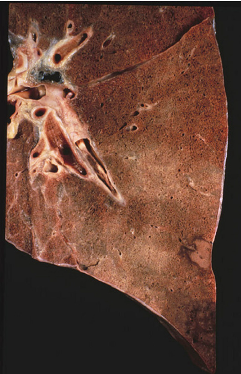 Perfusion-ventilation mismatch, which progresses to parenchymal damage in the lung.