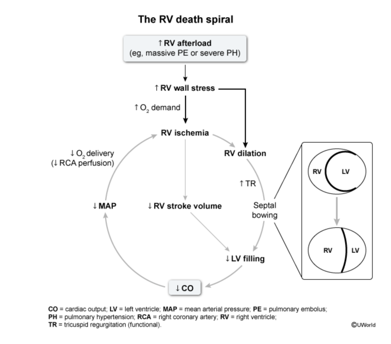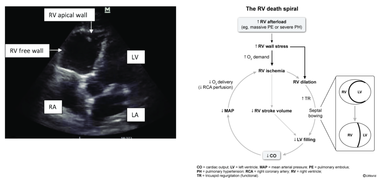 The apex of the right ventricle looks like a trampoline bouncing up and down. Explained further, the emergency bedside transthoracic echocardiography enables a presumptive diagnosis of pulmonary embolism (PE) based on key findings reflecting the underlying pathophysiology of right ventricle (RV) obstruction due to the clot. First, the acute rise in RV afterload leads to RV dilation due to a sudden increase in wall stress. With acute pressure overload, the RV has no time to adapt and can fail with even modest elevation of pulmonary vascular resistance if it occurs quickly enough. In contrast, slowly progressive processes such as pulmonary arterial hypertension allow for compensatory concentric RV hypertrophy and adaptation to the increased RV afterload. Because perfusion of the RV occurs in both systole and diastole, the RV is especially susceptible to global ischemia in the setting of systemic hypotension. RV ischemia causes further dilation and impairs its systolic function, causing global hypokinesis. Systemic venous return is impaired as the RV struggles to eject; therefore, engorgement of the inferior vena cava would be more typical than collapse. Loss of RV stroke volume leads to underfilling of the left ventricle (LV), which leads to decreased cardiac output. In addition, RV dilation causes septal incursion into the LV, further compromising its diastolic filling. RV dysfunction and systemic hypotension reinforce each other in a vicious spiral, which quickly leads to death if not treated (eg, thrombolysis) urgently, therefore justifying the use of an ECHO in emergent conditions (i.e. hemodynamic instability).