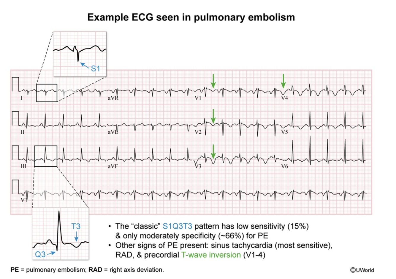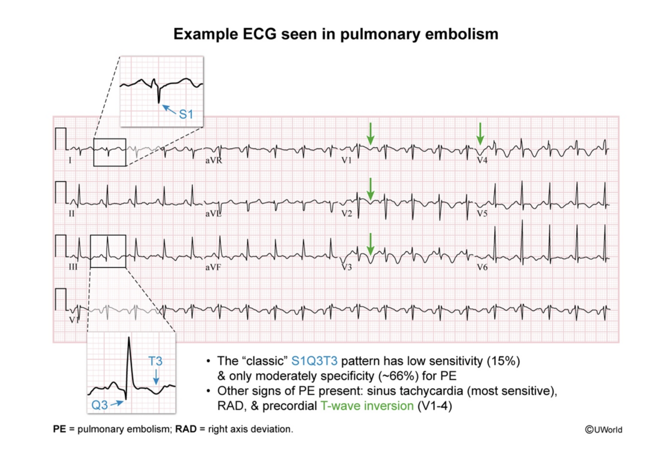 Sinus tachycardia or non-specific changes (T-wave inversions) are the most common, however a pattern that is very specific for pulmonary embolism is the S1Q3T3 pattern (S wave in lead I, Q wave and T wave inversion in lead III) but is a less common (low sensitivity, high specificity) finding. The underlying pathophysiology for this ECG pattern is acute right ventricular strain (right axis deviation, S1Q3T3, precordial T-wave inversions). Another sign of right heart strain is an incomplete or full-on RBBB. The troponin could also be elevated.