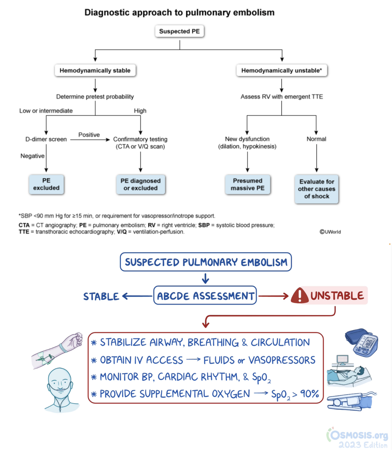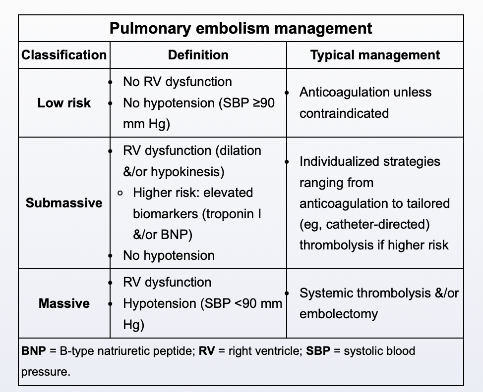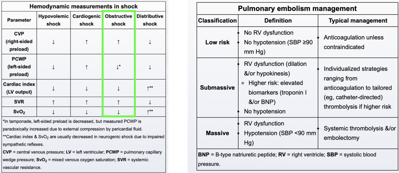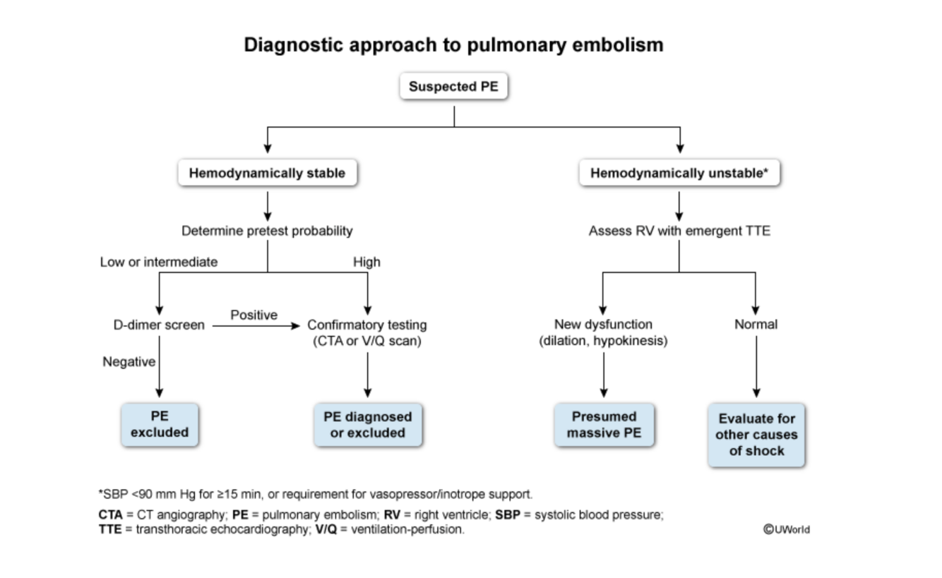 Patients with sudden-onset dyspnea and severe hypoxemia despite clear lungs, hypotension, tachycardia, and cold extremities, findings consistent with either cardiogenic or obstructive shock, require emergency bedside transthoracic echocardiography due to both the hemodynamically instability (ie, systolic blood pressure <90 mm Hg), and the need to quickly evaluate with imaging. (TTE) serves 2 purposes. First. it establishes a presumptive diagnosis of massive PE based on surrogate evidence, such as right ventricle (RV) dilation or hypokinesis (reduced systolic function). Second, it identifies other causes of shock, such as severe hypovolemia, cardiac tamponade (compressive effusion), or left-sided heart failure. An echocardiographic finding of RV dilation (“blown RV”) coupled with hypotension is generally thought to warrant empiric thrombolysis. Although CT angiography can confirm PE, it is unsafe in hemodynamically unstable patients given the risk for circulatory collapse (eg, cardiac arrest in the scanner or during transport) and should not delay thrombolysis.