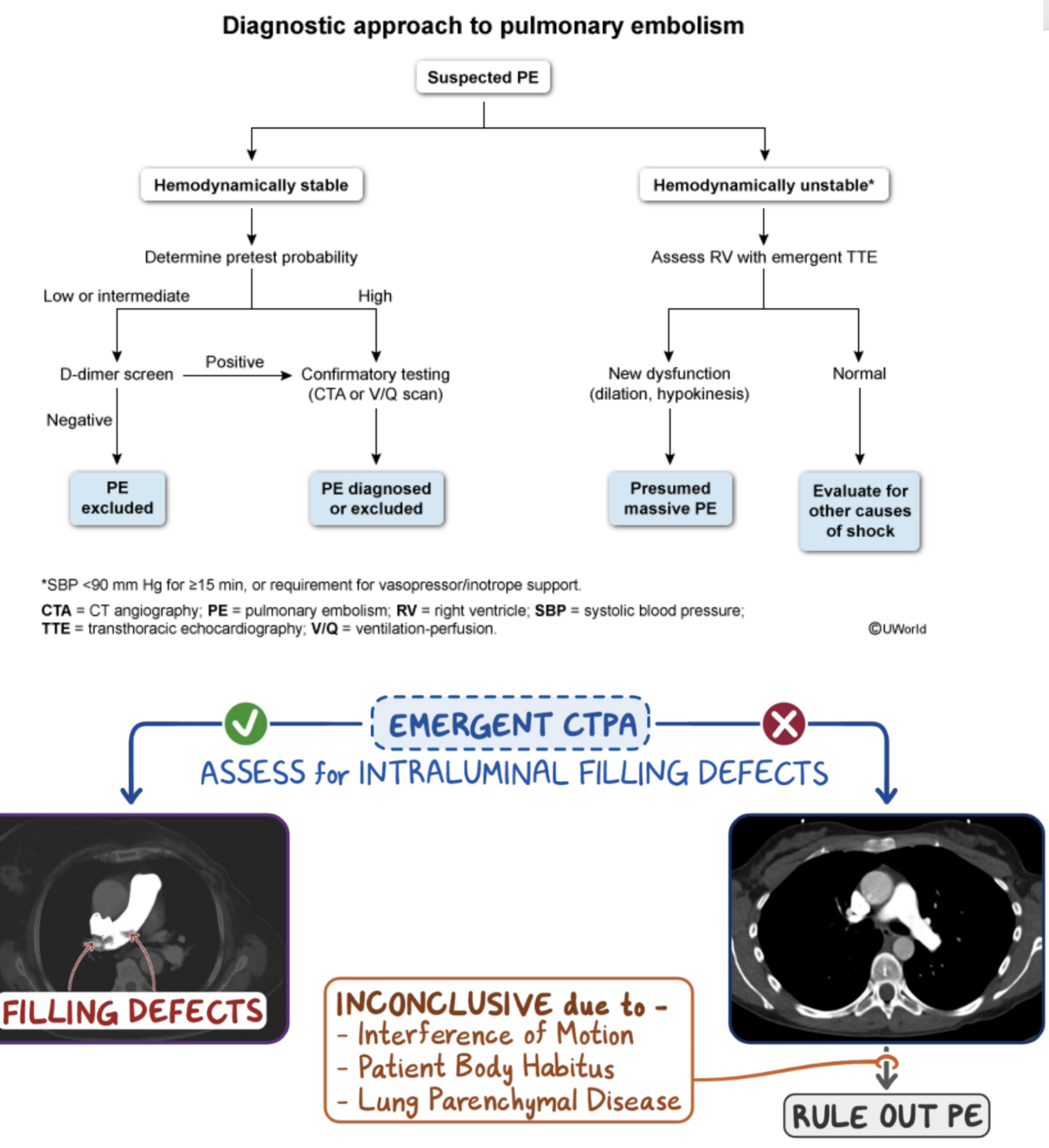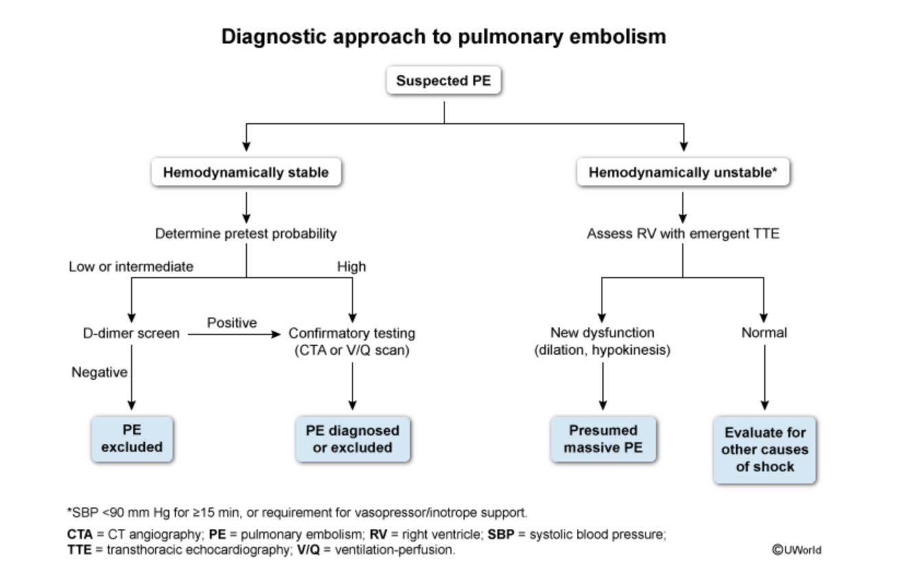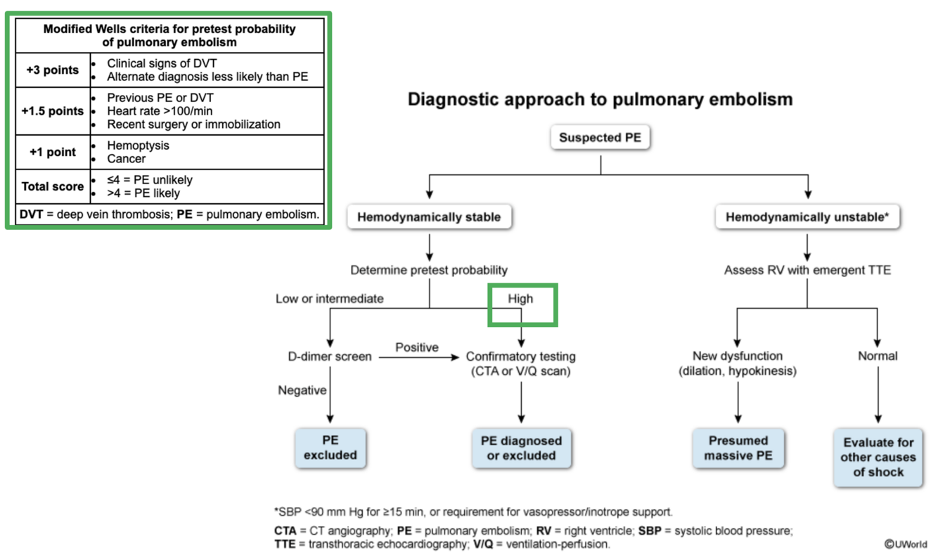 CT pulmonary angiography (CTPA) to detect intraluminal filling defects in the pulmonary circulation, a.k.a. spiral CT angiography. In hemodynamically stable (ie, systolic blood pressure ≥90 mm Hg) patients with a high pretest probability for PE, the next step is to proceed directly to confirmatory testing with pulmonary CT angiography (CTA) (also known as CTA PE protocol) or a ventilation-perfusion study. PE is confirmed if CTA reveals filling defects in the pulmonary arteries.