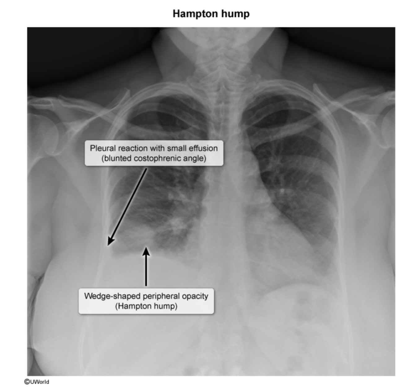 Hampton hump. Chest x-ray findings that suggest a PE are wedge-shaped opacities and the adjacent blunted costophrenic angles due to reactive or inflammatory pleural effusion.