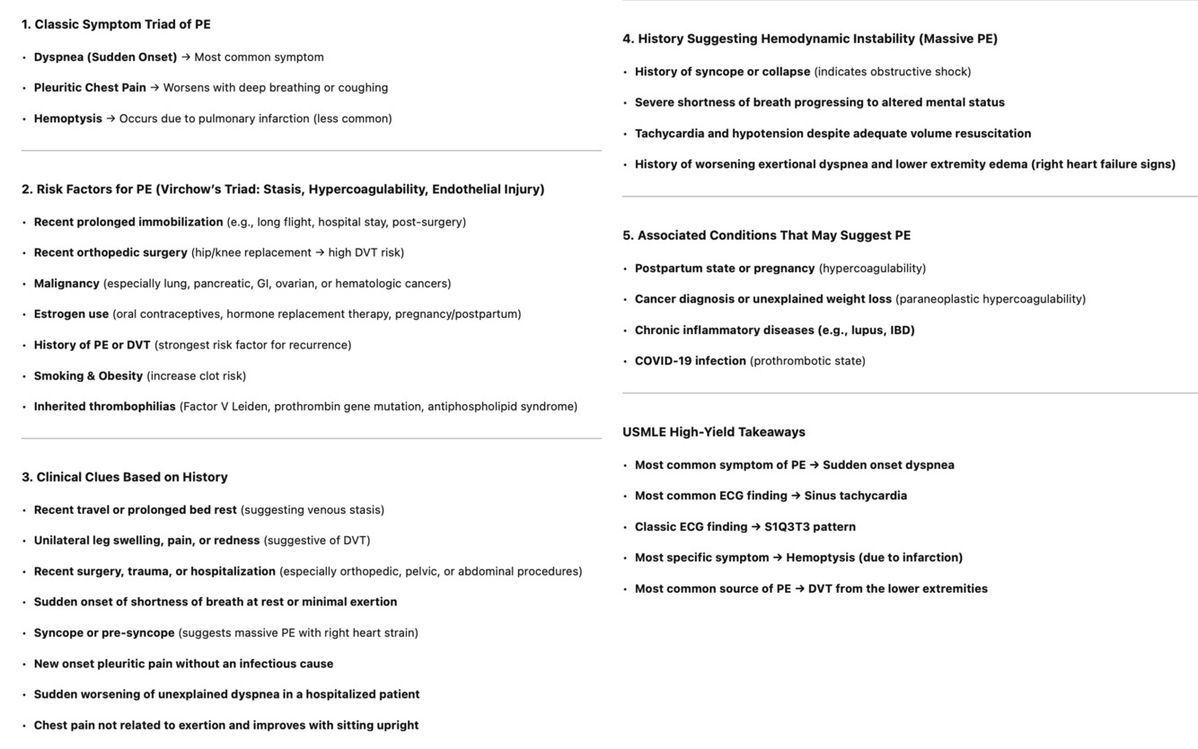 Risk Factors for PE (Virchow’s Triad: Stasis, Hypercoagulability, Endothelial Injury).
