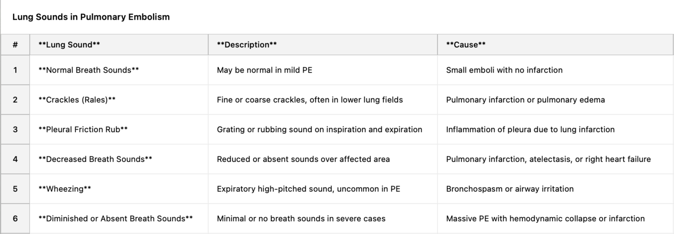 This is usually unreliable as lung sound can be clear to diminished breath sounds to rales. Wheezing is uncommon but can occur due to inflammation and irritation, even following resolution of the PE.