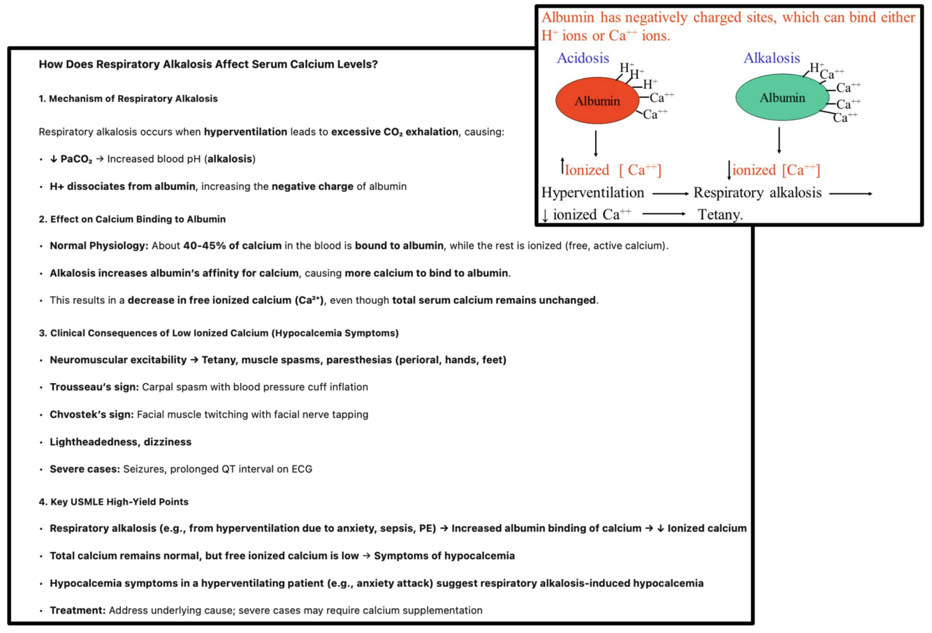 Respiratory alkalosis. This can change the calcium levels, leading to decreased levels of ionized calcium.