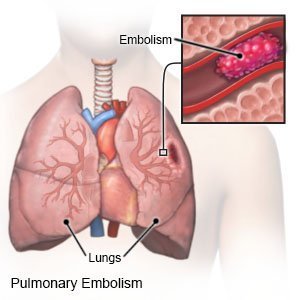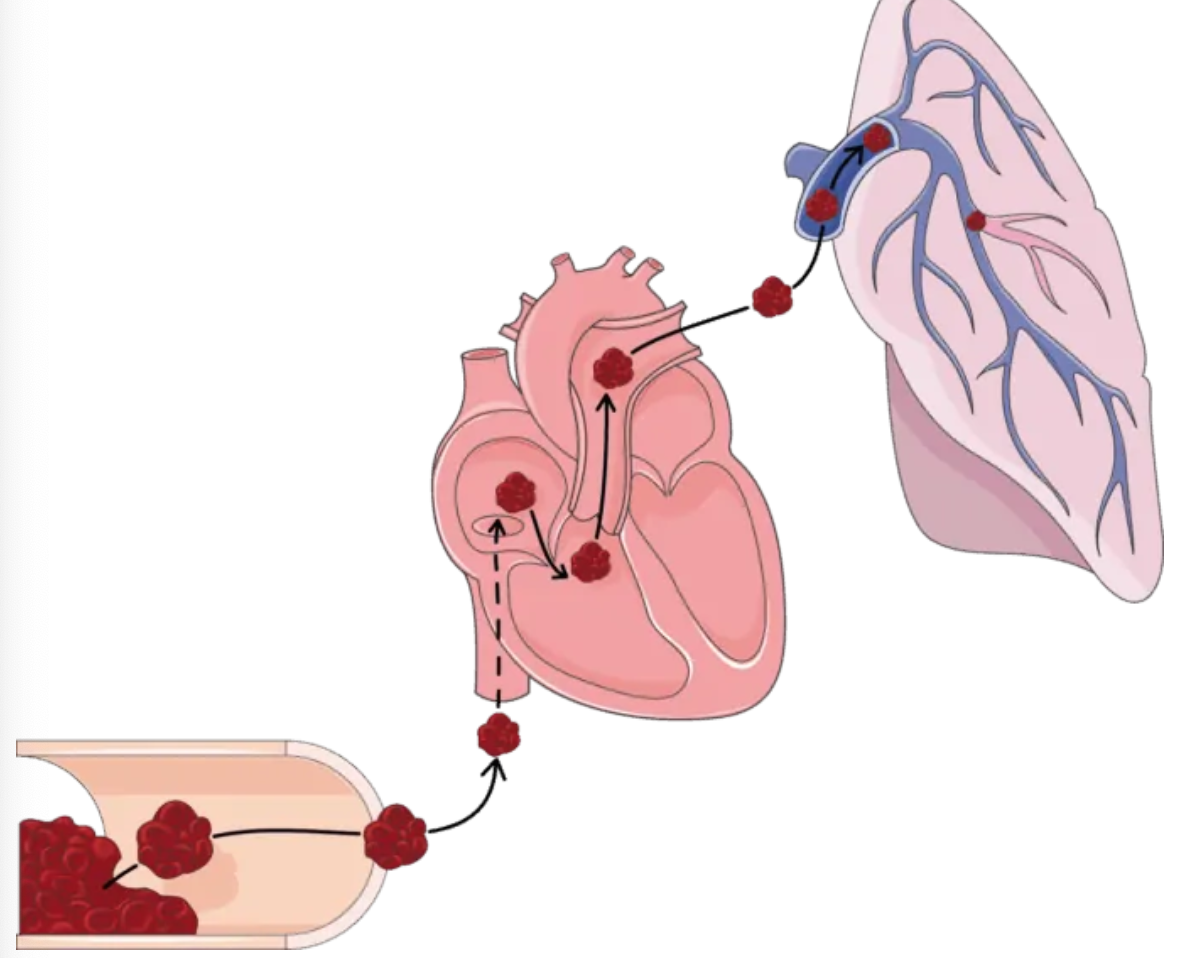 e.g. clot in the legs (DVT) becomes dislodged and flows via the bloodstream, through the right side of the heart, and becomes lodged in the pulmonary circulation