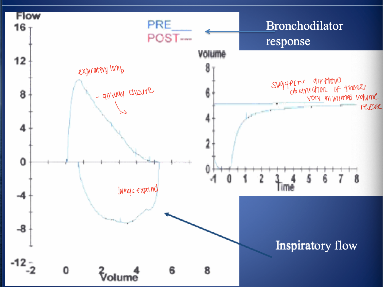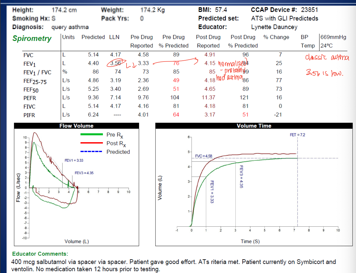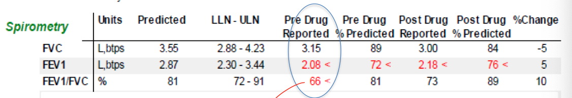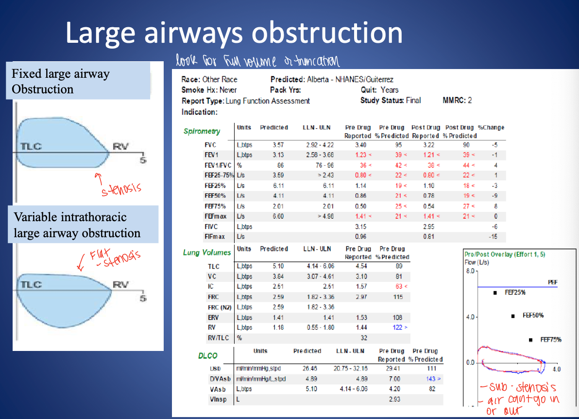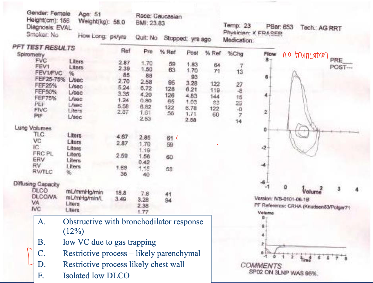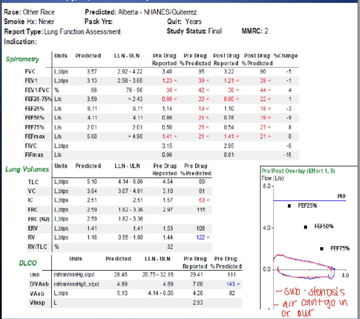 FEV1/FVC is way below 70. also he flow curve is scooped, it’s a large airway obstruction.