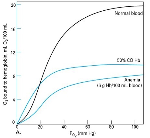 Look at the anemia curve. At a PO2 of 100 mmHg, how much O2 mL will be carried/ dL of blood?