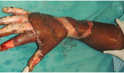 Aspecto de la piel con quemadura de 3er grado por fuego o deflagración: