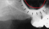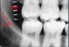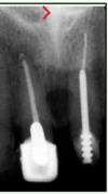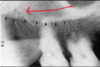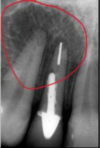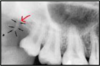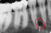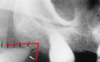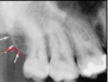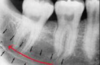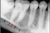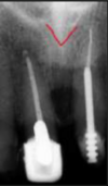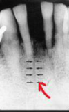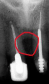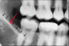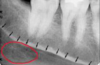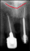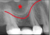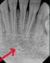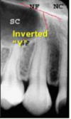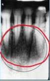 a dark shadow obscures the apices of the maxillary teeth