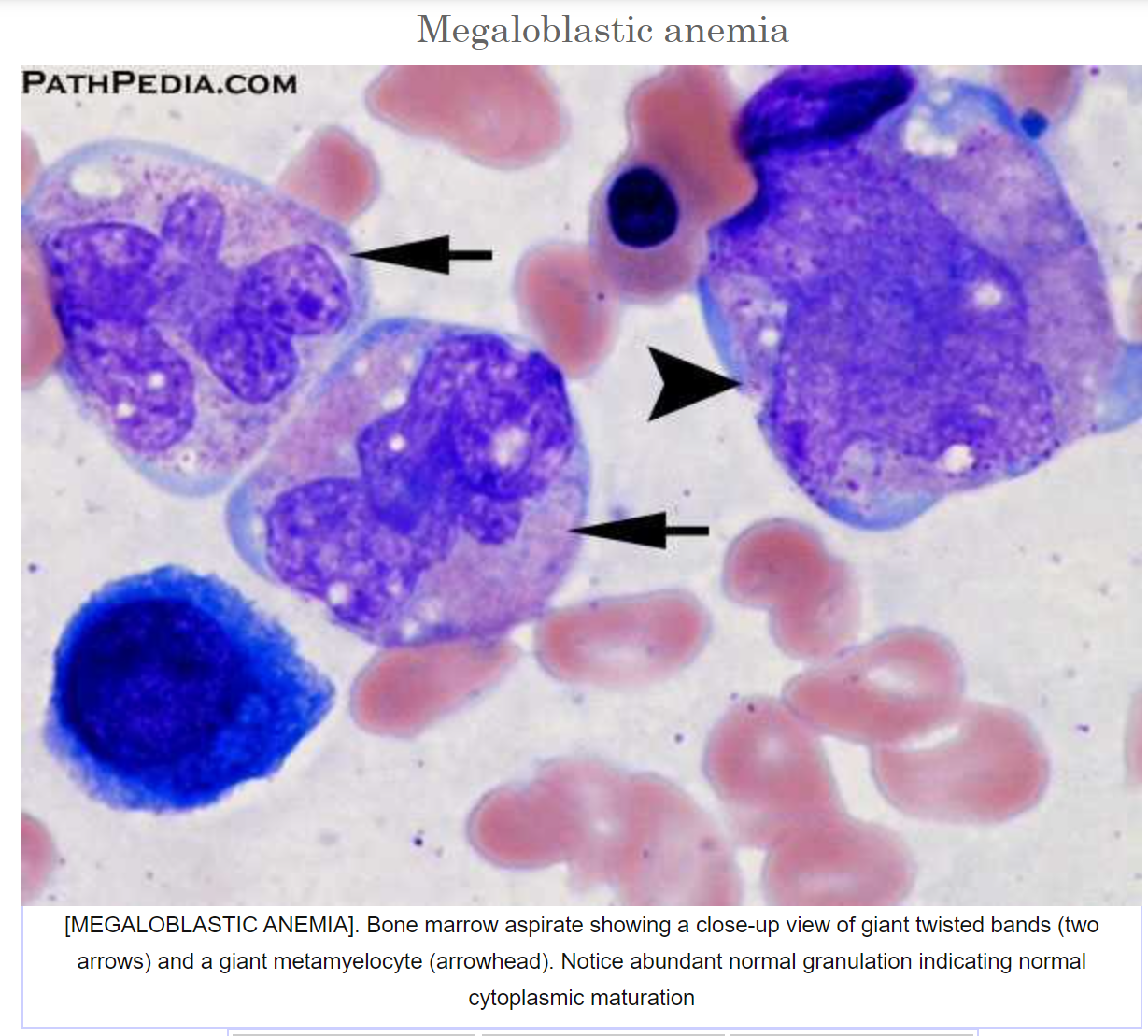 Neutrophils are larger than normal and show nuclear hypersegmentation, having five or more nuclear lobules instead of the normal three to four