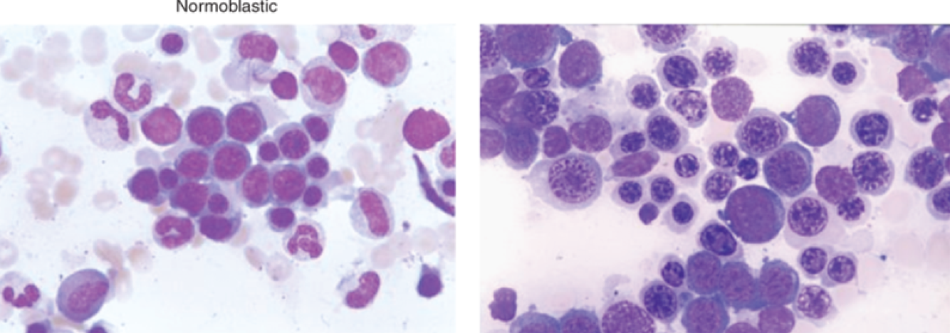 The attached image compares a marrow aspirate from a normal individual with the BM aspirate from an individual with the condition described below: