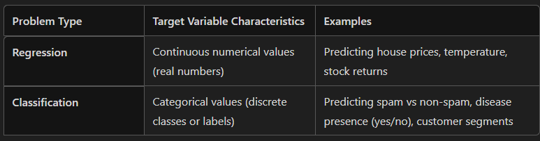 In supervised machine learning, what characteristics of the target variable determine whether a problem is classified as regression or classification?