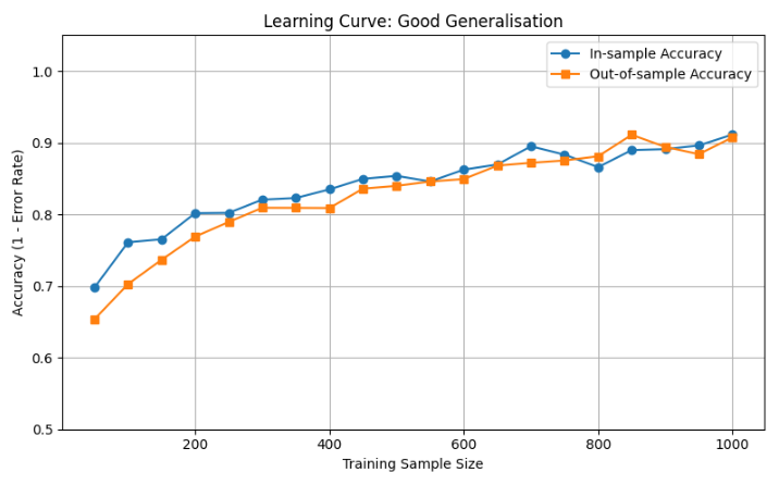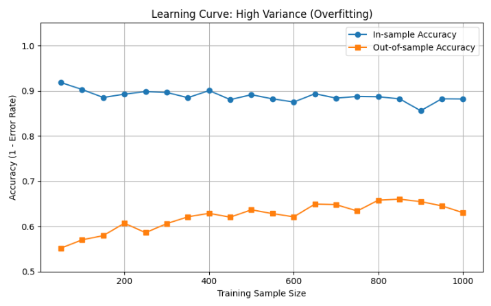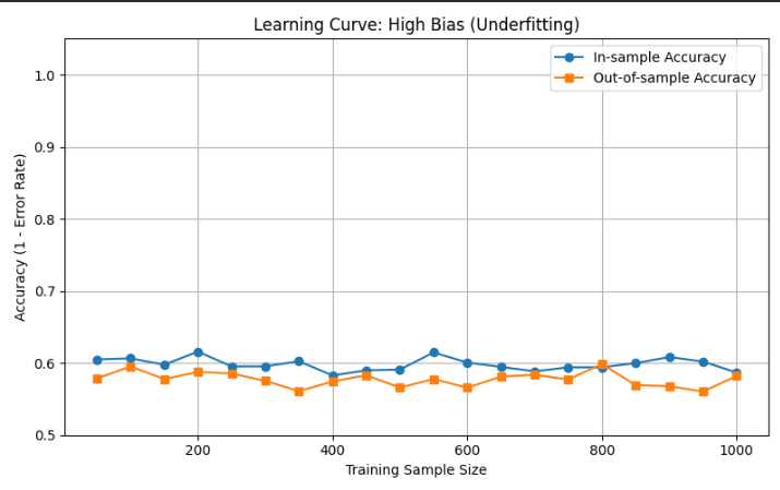 Out-of-sample accuracy is also low and doesn’t improve with more data.