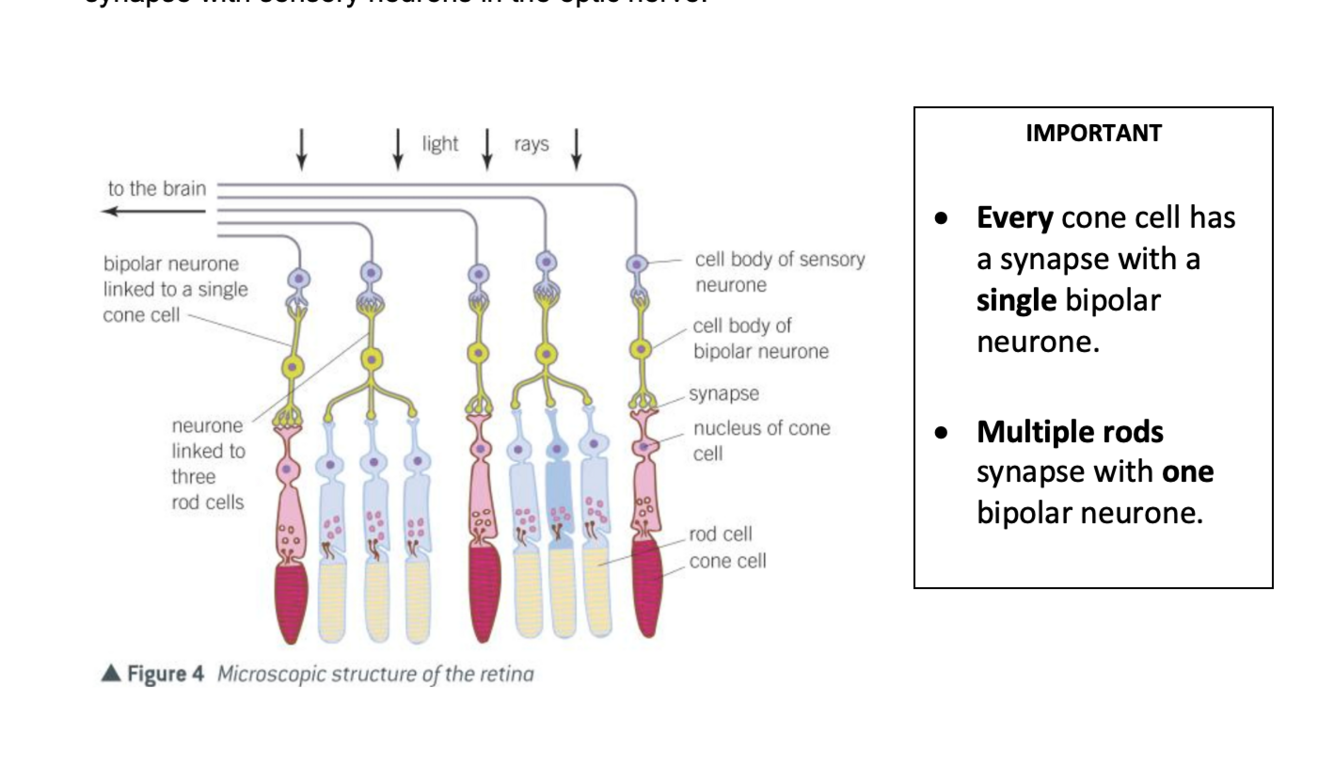 - Retinal convergence due to several rods sharing a single BIPOLAR neuron.