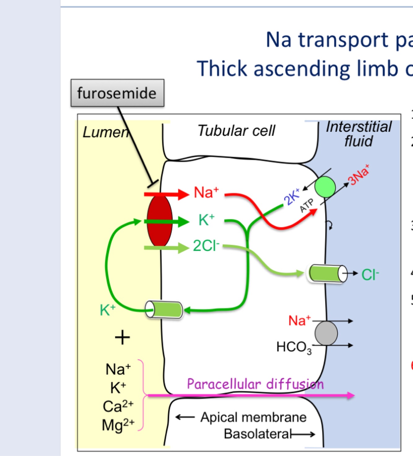 NKCC2 transporter pumps sodium, 2 chlorides and potassium of lumen filtrate into tubule cells of the ascending limb.