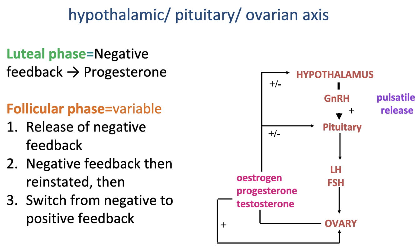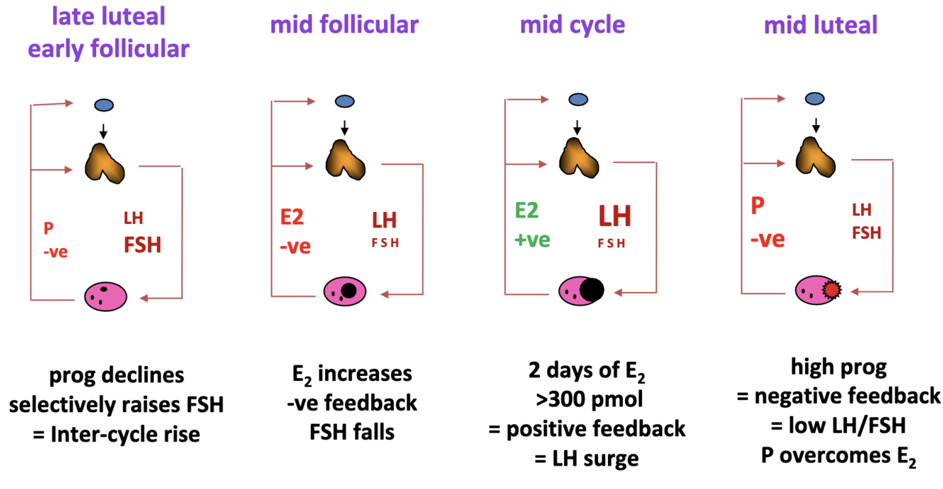 Throughout the follicular phase, oestrogen feedback was negative. At the end of the follicular phase, oestrogen levels are raised for long enough that feedback switches from negative to positive.
