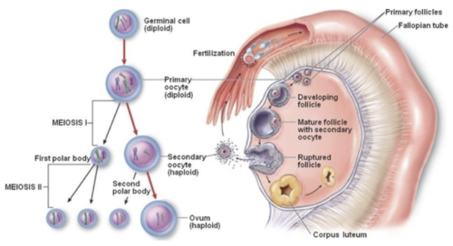 Half of the chromosomes are put into an egg called the ‘first polar body’. The egg is now a secondary oocyte. The first polar body plays no further part in the process and does not divide again.