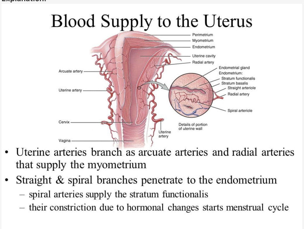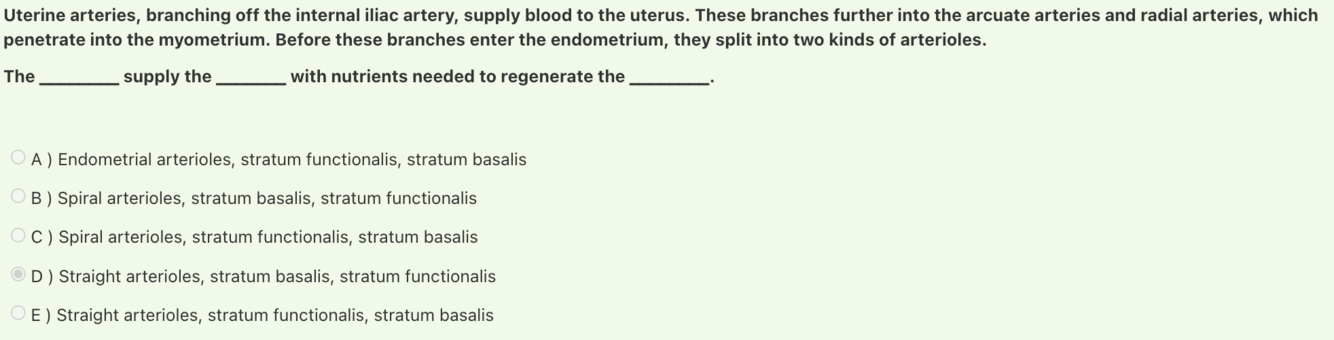 Answer: Straight arterioles, stratum basalis, stratum functionalis