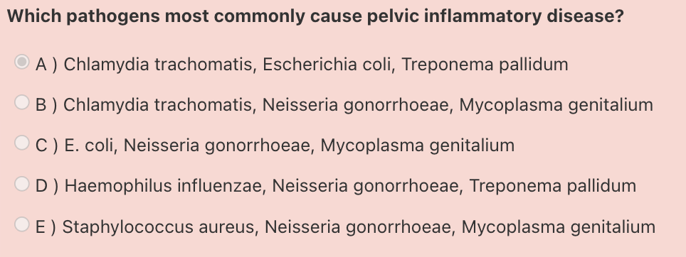 Answer: Chlamydia trachomatis, Neisseria gonorrhoeae, Mycoplasma genitalium