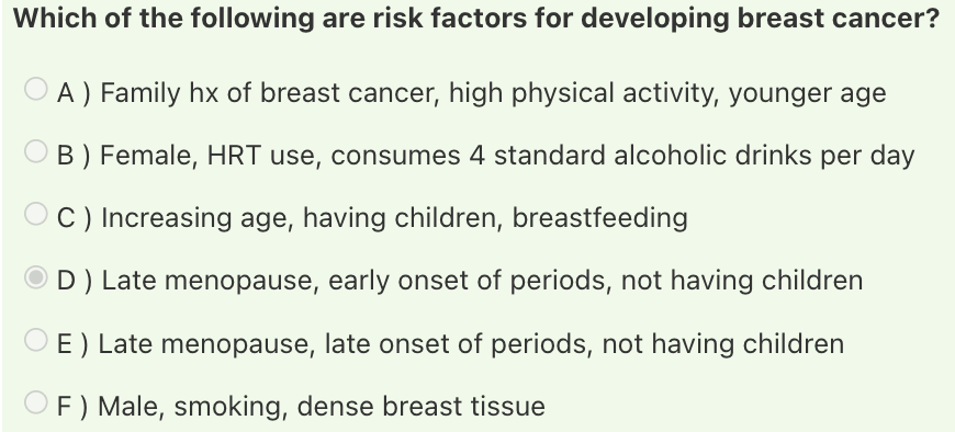 Answer: Late menopause, early onset of periods, not having children